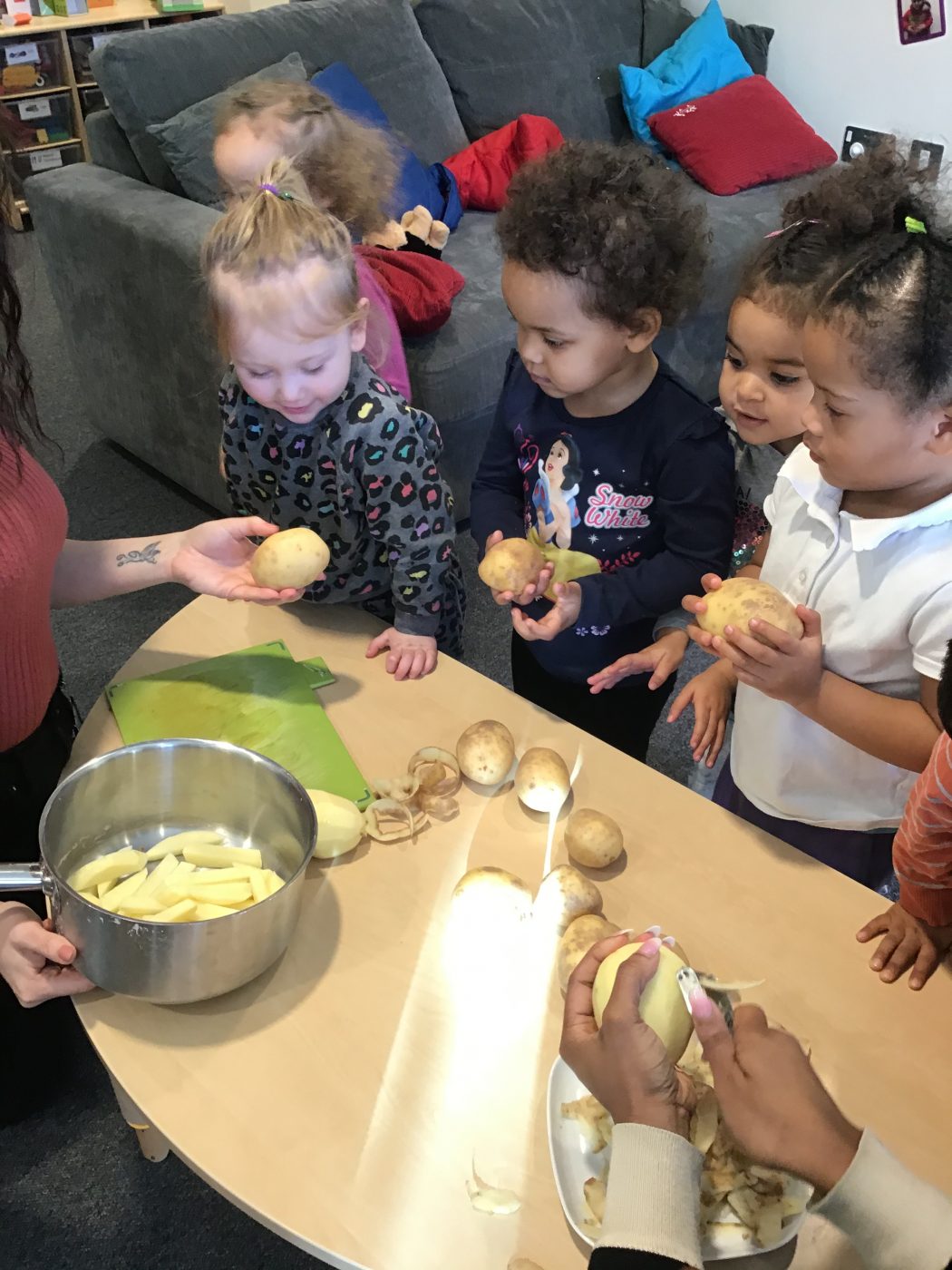 Fruits and vegetables are essential for children. Our staff play a key role in introducing the children to a wide variety of foods and establishing a pattern of regular meals and healthy snacks. Staff encourage interaction between the children, good table manners and the development of social skills. Staff are also on hand to support and assist, if needed.